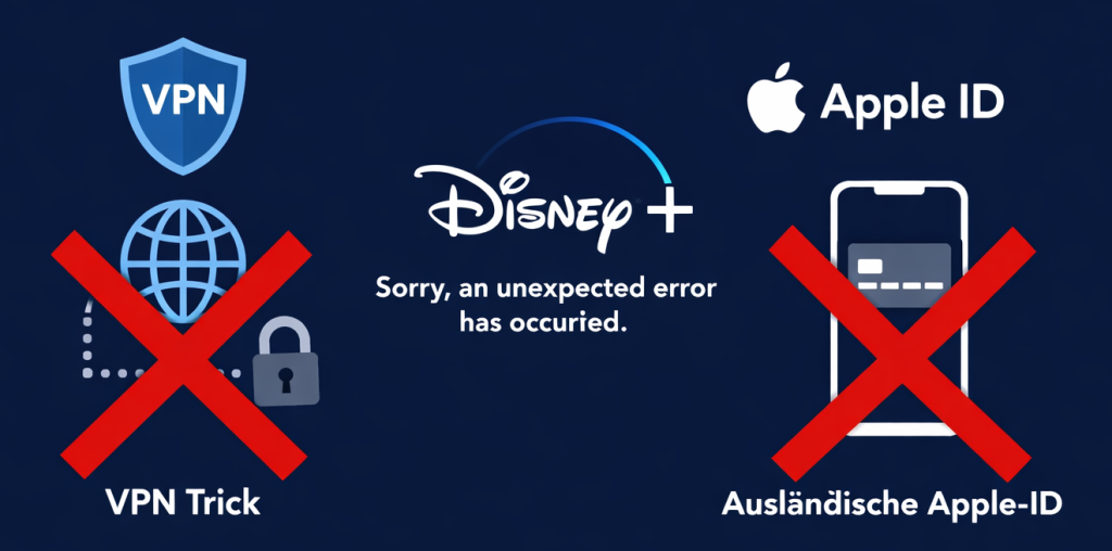 Wer Disney+ günstiger abonnieren möchte, stößt im Internet schnell auf ältere Spartipps. Besonders häufig wurde früher empfohlen, den Abschluss per VPN über ein günstigeres Land durchzuführen. In der Praxis funktioniert diese Methode jedoch heute nicht mehr. Disney+ prüft den Zugriff inzwischen deutlich strenger (IP-Blacklists) und verlangt inländische Zahlungsmethoden. Nutzer, die es versuchen, erhalten die Mitteilung „Sorry, an unexpected error has occurred”.